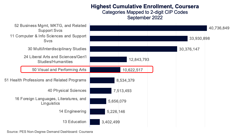 The arts aren’t just popular in traditional higher education. We mapped Coursera’s course parent categories to two-digit CIP codes from IPEDS and visual and performing arts had the fifth-strongest cumulative enrollment in September 2022, beating two traditionally dominant programs in higher ed: health professions and engineering.